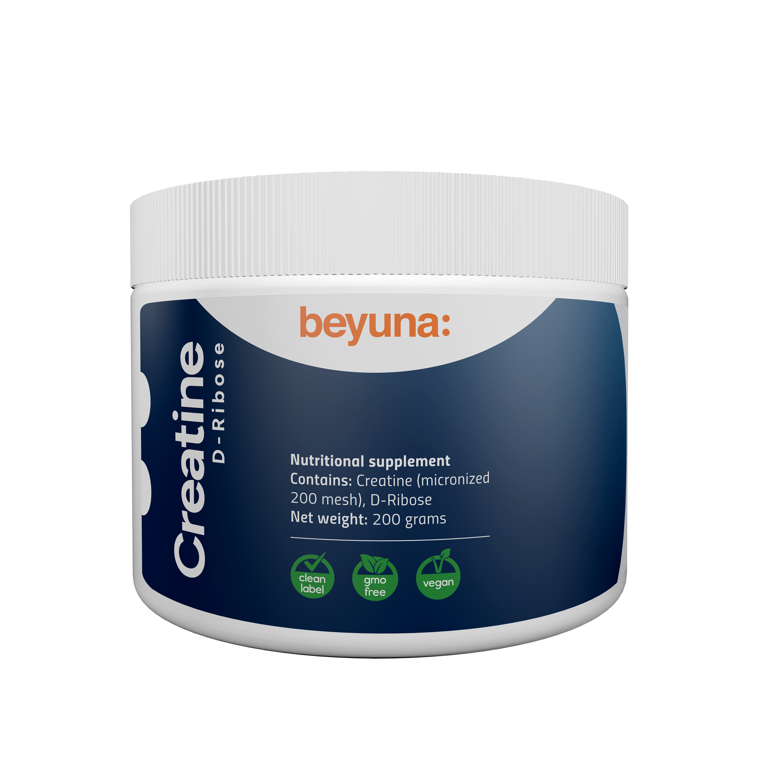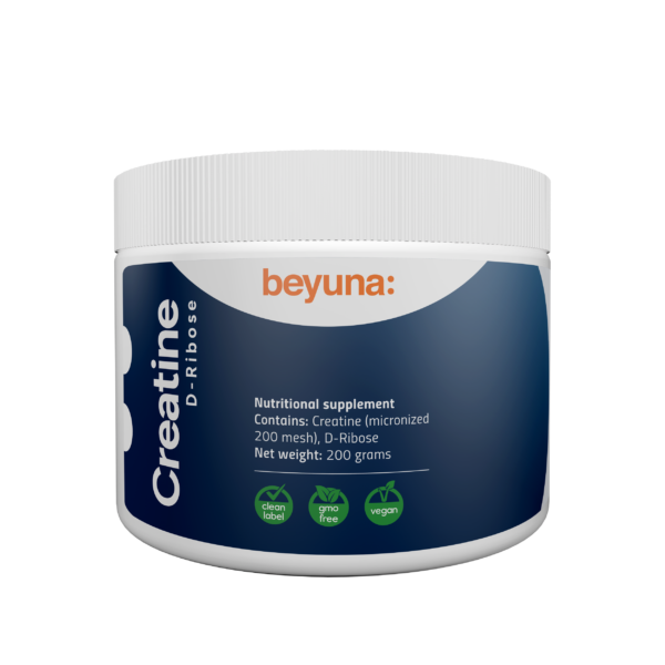 Beyuna Creatine bestaat uit creatinemonohydraat gemicroniseerd tot 200 mesh en D-Ribose. Bij een dagelijkse inname van 3 gram stimuleert creatine spiergroei/(vetvrije)spiermassa bij explosieve krachtsinspanningen, en helpt het prestaties te verbeteren bij explosieve krachtsinspanningen. Los 5 gram poeder op in een glas water en drink dagelijks. Beyuna Creatine is allergeenvrij, vegan, GMO-vrij en Clean Label. Pot met een inhoud van 200 gram. De ean-code van dit artikel is 8719925122545.